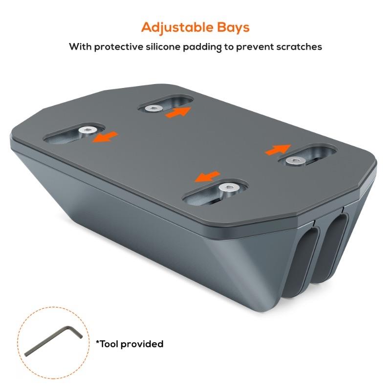 Unique dual bay design with adjustable size, seating devices up to 34mm in thickness, dock your tablet and laptop simply and securely.
