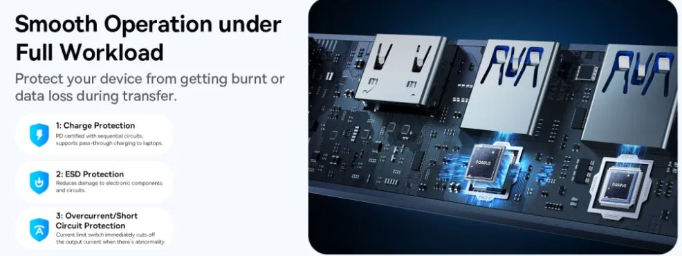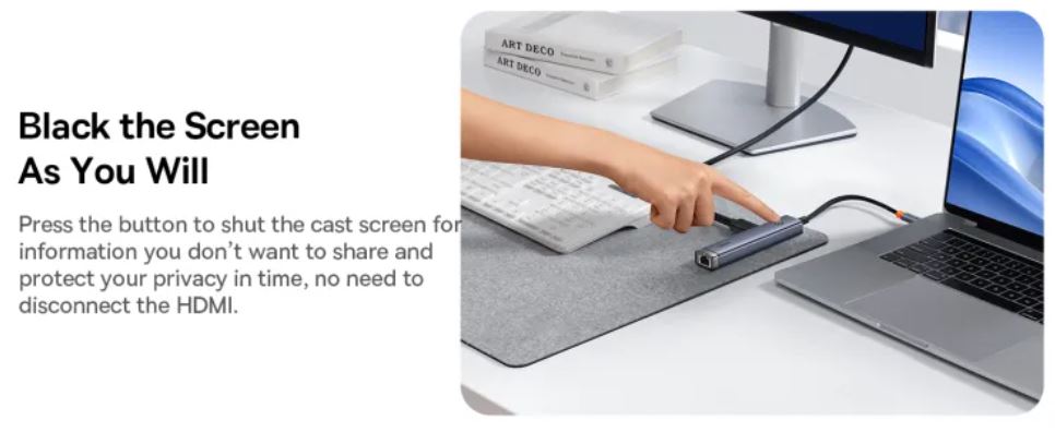 The Baseus Ultra Joy BS-OH165 also offers an indicator for screen casting support via the Type-C port, as well as a convenient button for quickly disabling screen sharing. The hub also provides excellent heat dissipation properties and protection against overloading and short circuits, enhancing user safety.